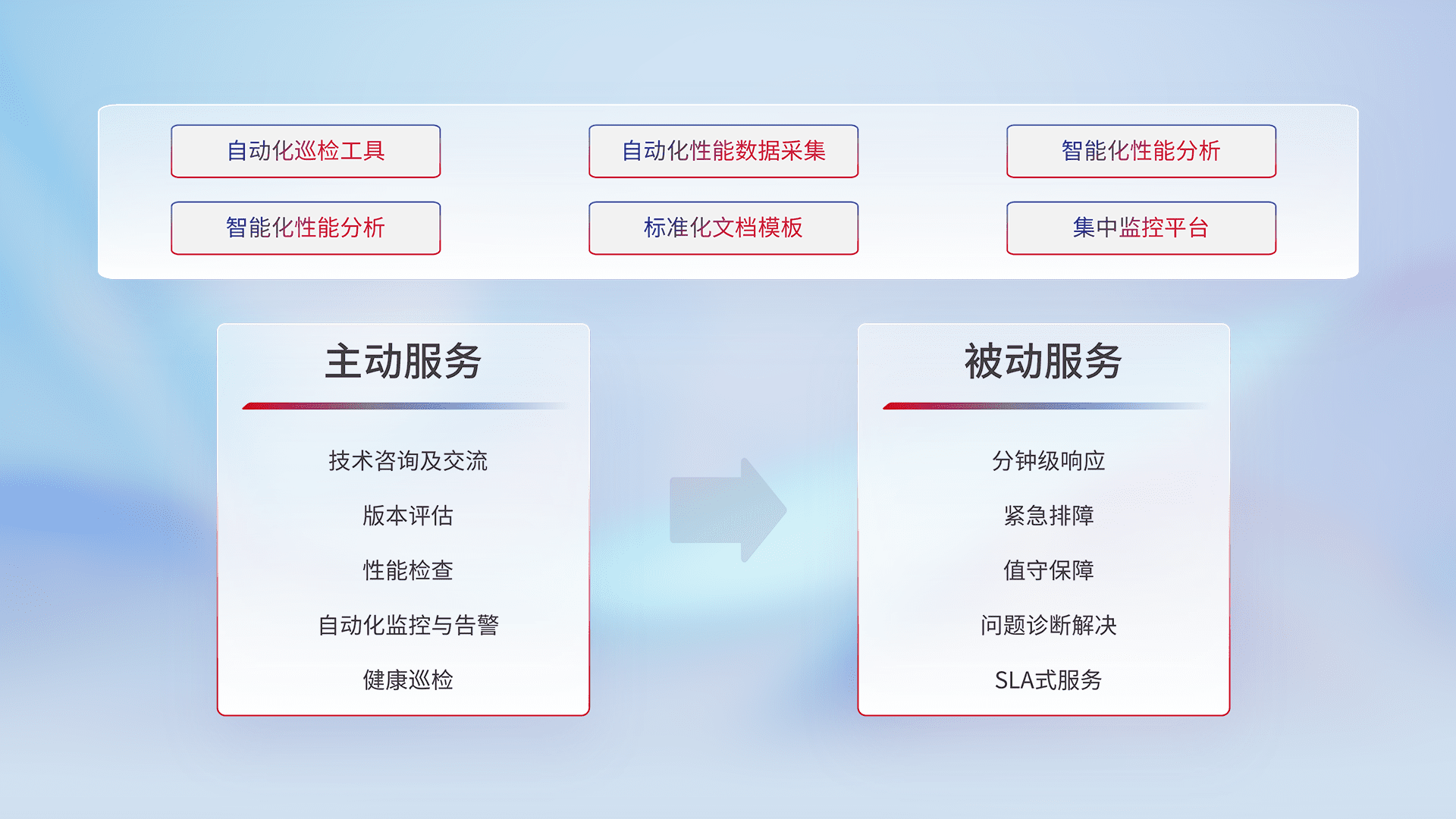 智能化工具和标准化文档,,保障服务质量,,提供主动服务(包含技术咨询、、、、版本评估、、、性能检查、、、、自动化监控与告警、、健康巡检)和被动服务包含(分钟级响应、、、紧急排障、、、值守保障、、、、问题诊断解决、、SLA服务)。。。